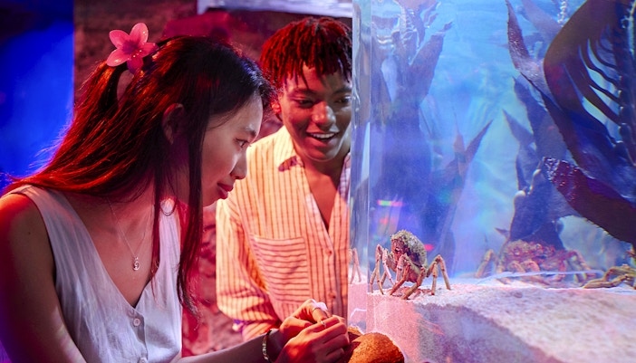 Walk through a fully enclosed underwater tunnel as blacktip reef sharks, rays, and green sea turtles glide overhead. Lighting and ambient sound recreate open ocean conditions, offering dramatic close range views and insight into tropical marine ecosystems and predator behavior.